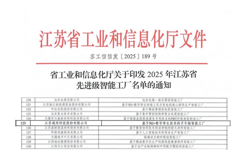近日,江蘇省工業和信息化廳正式公布2025年江蘇省先進級智能工廠名單,通用股份榮耀上榜。這一榮譽不僅是對通用股份前瞻創新實踐的高度認可
