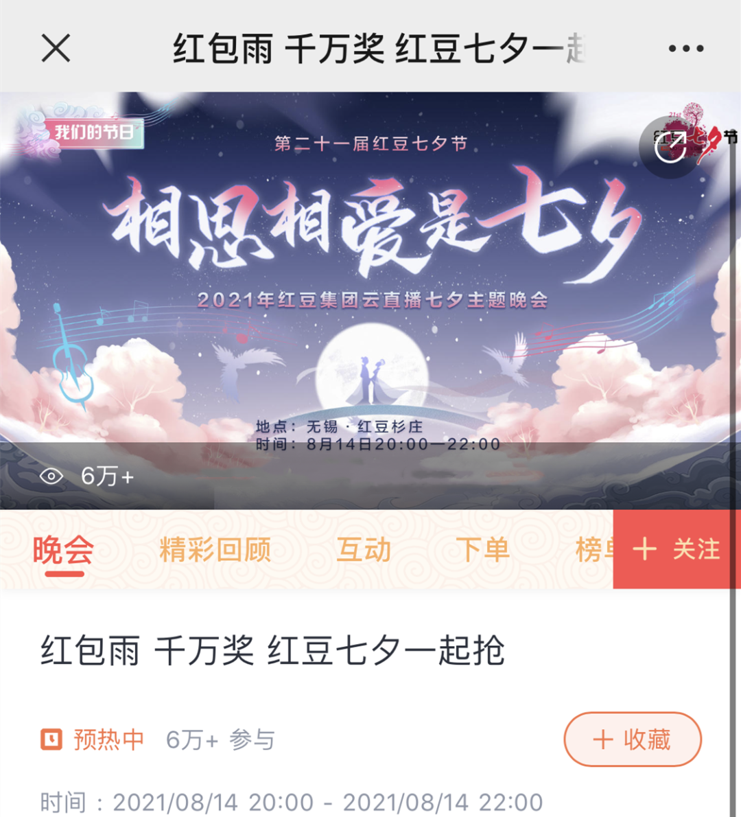 除了央視的七夕晚會,紅豆集團還會給大家奉獻一場特別的紅豆七夕節晚會。與大家在七夕節當晚共享視覺與福利盛宴。去年的紅豆七夕節20周年直播主題晚會更是創造了1.2億直播觀看量!