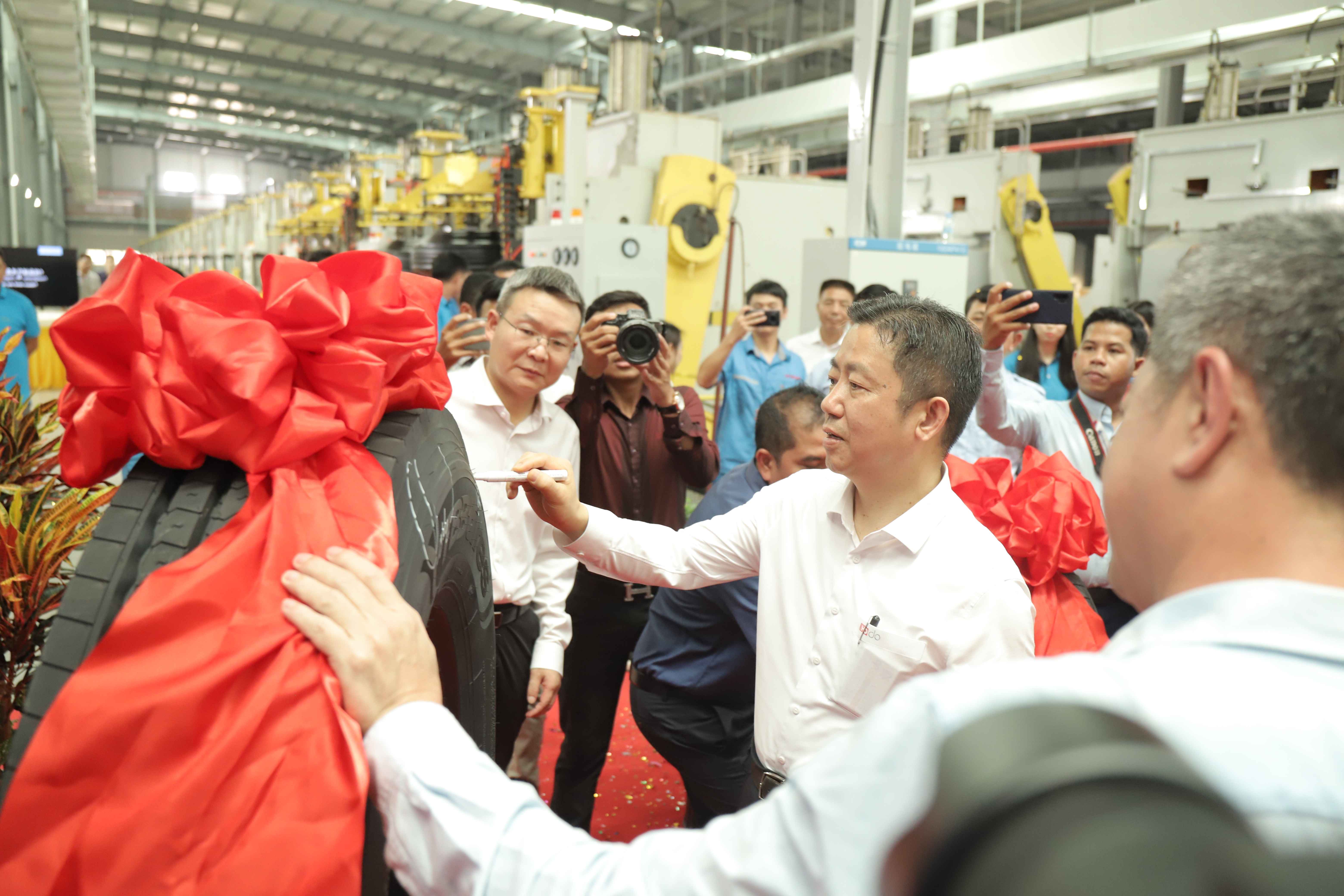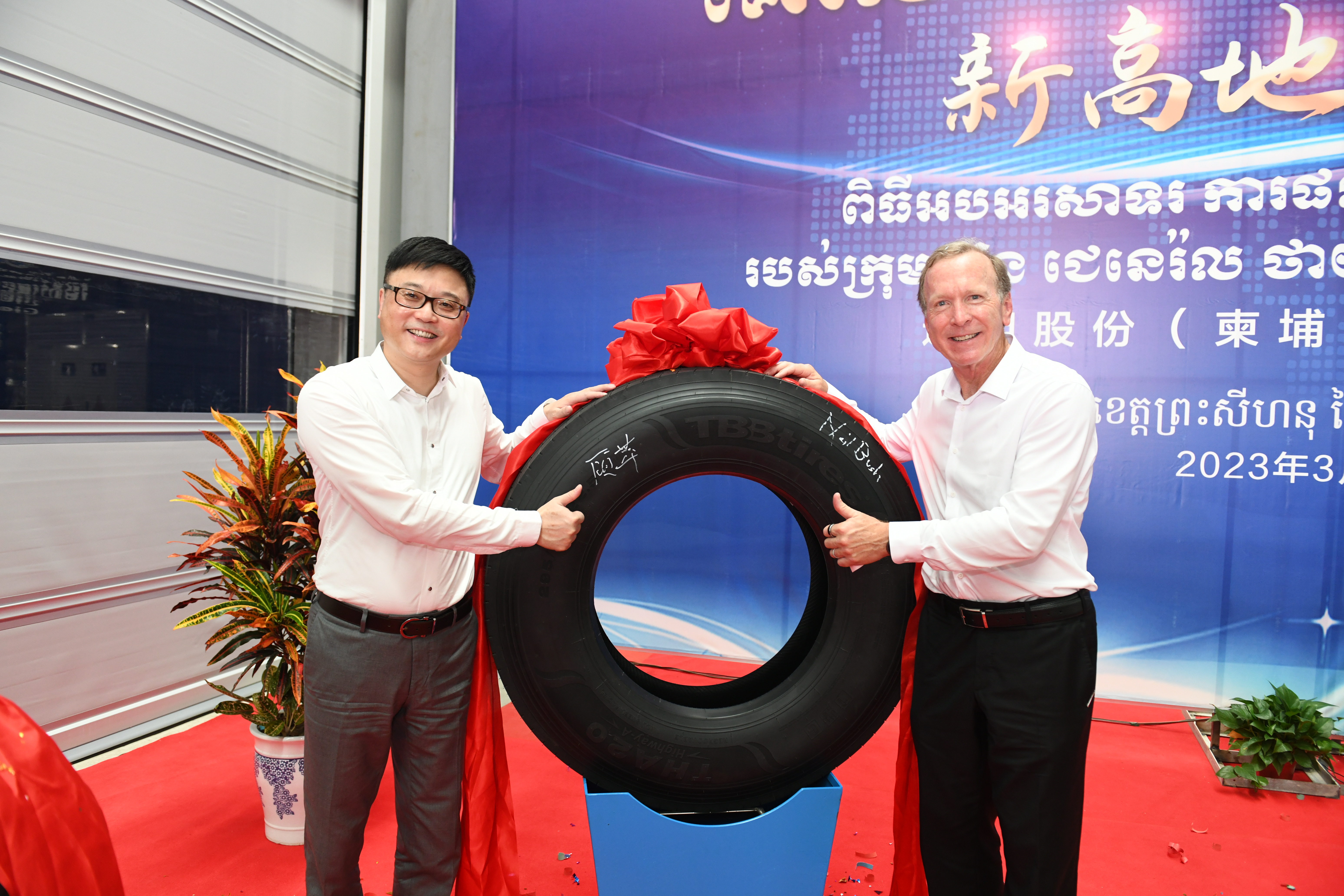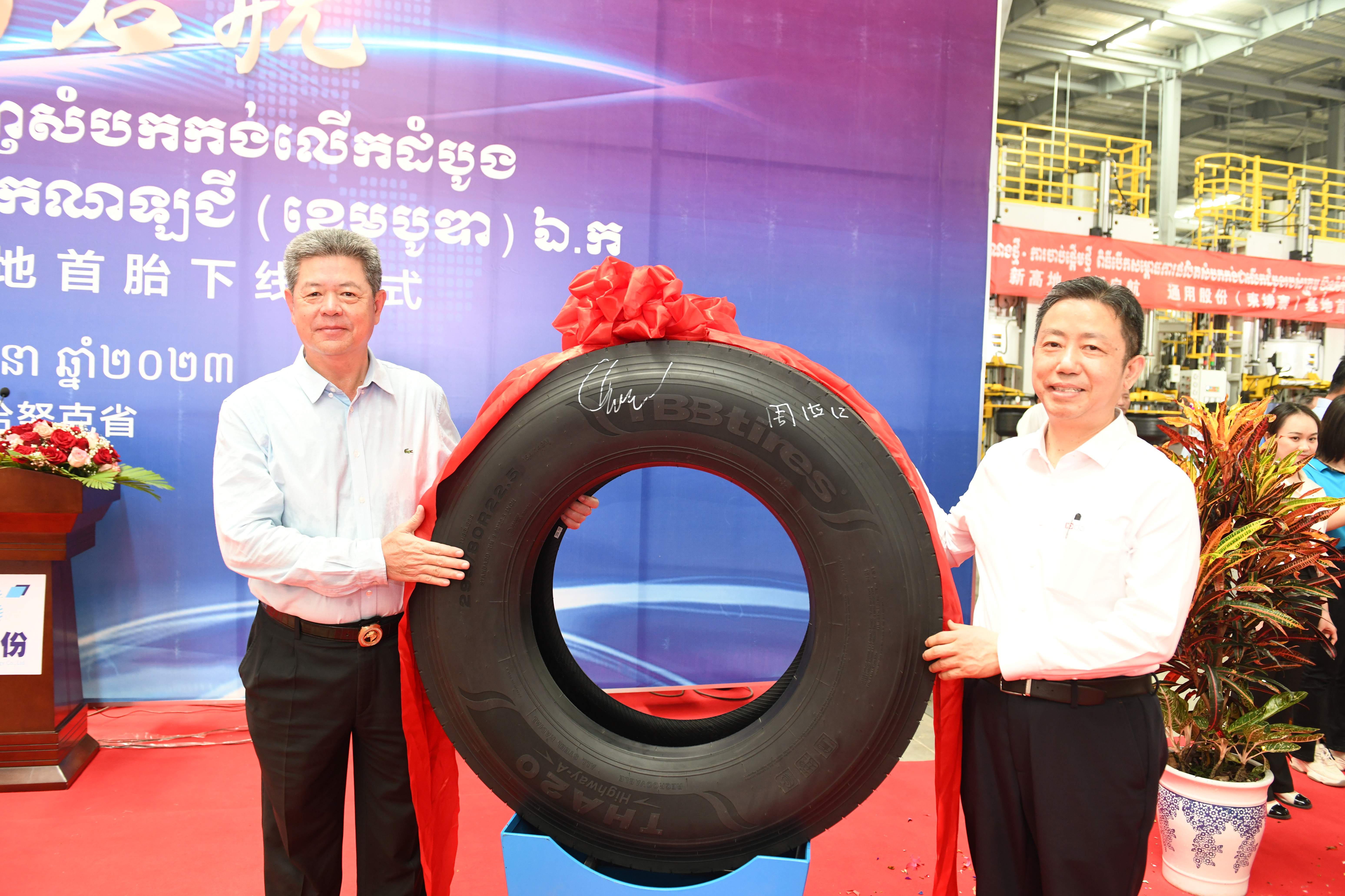 “5、4、3、2、1,出鍋!.......”3月18日,在通用輪胎科技柬埔寨公司總經(jīng)理陶國(guó)忠的倒數(shù)聲中,柬埔寨工廠首胎成功下線,標(biāo)志著通用股份海外“雙基地”的正式建成、全面啟航。在首胎下線儀式上,西哈努克省省長(zhǎng)郭宗仁、喬治·布什美中關(guān)系基金會(huì)創(chuàng)始人兼主席尼爾·布什,中國(guó)民營(yíng)經(jīng)濟(jì)國(guó)際合作商會(huì)會(huì)長(zhǎng)、紅豆集團(tuán)董事局主席周海江,通用股份董事長(zhǎng)顧萃等相關(guān)領(lǐng)導(dǎo)和全體員工共同見(jiàn)證了這一歷史時(shí)刻。